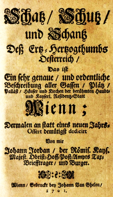 Das älteste Wiener Postbüchel, das nach bisherigem Wissen erhalten geblieben ist, verfasste Johann Jordan (1665-1738). In der Geschichte der Stadt wird er als „kaiserlicher Postamtsbriefträger und Käsestecher“ geführt. 1701 ließ er das erste Wiener Gassenverzeichnis unter dem Titel „Schatz, Schutz und Schanz des Erzherzogtums Österreichs“ drucken, eine „sehr genaue und ordentliche Beschreibung aller Gassen, Platz, Palläst, Häuser und Kirchen“. Damit half er erheblich bei der Orientierung in der Stadt, denn bis zur Einführung der Häusernummerierung durch Kaiserin Maria Theresia 1770 waren nur Schilder und Besitzernamen Anhaltspunkte für die Adresse.