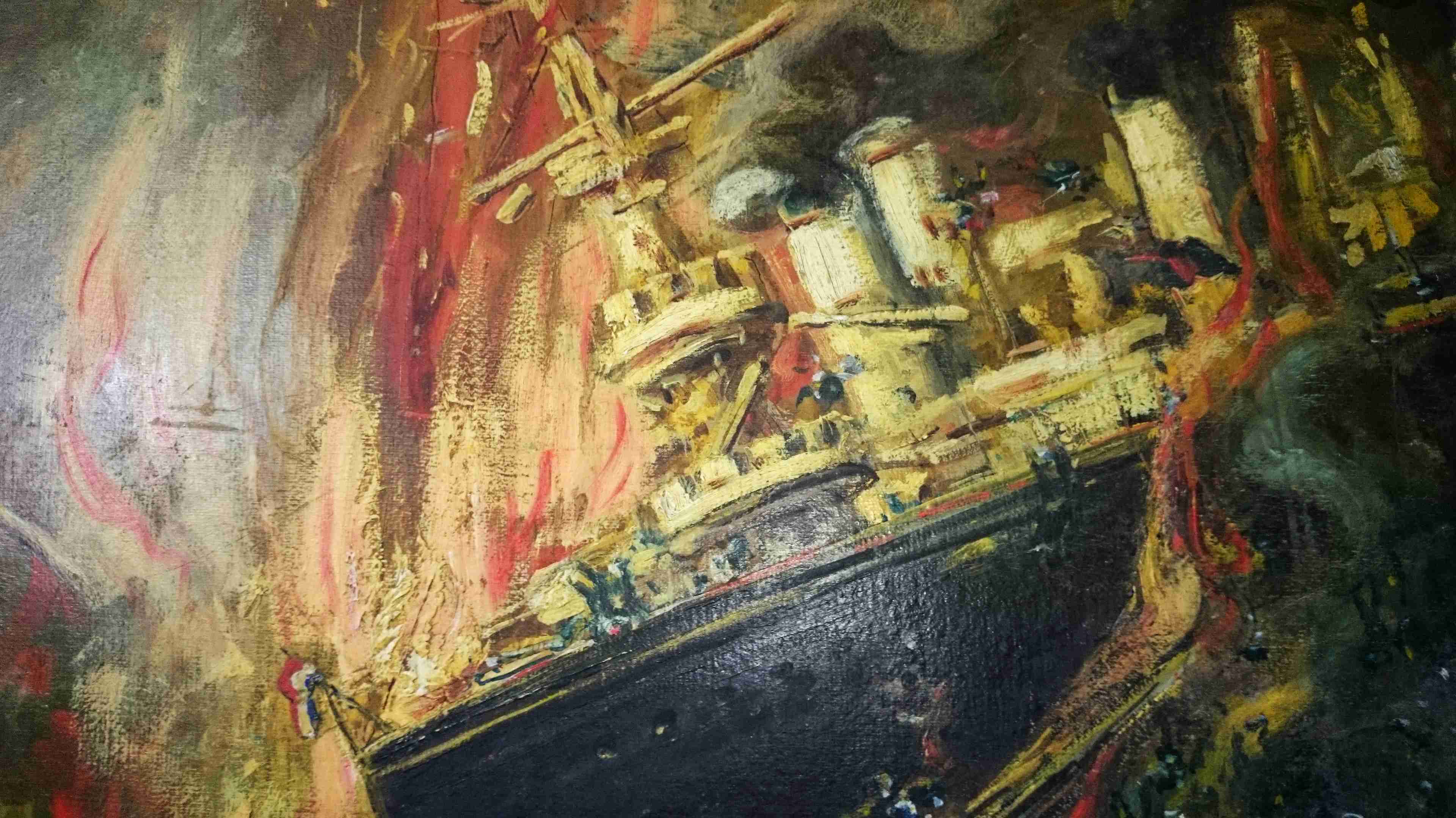DSC_1354-c1Arthur Kurtz malte diese Szene in eindrucksvoll expressiver Pinselführung. Die Ausführung macht deutlich, wie sehr ihn dieses historische Ereignis erschüttert haben muss. Wohl weniger wegen des Namens „Port Arthur“ (heute Teil der chinesischen Hafenstadt Dalian), aber vor allem wegen des dramatischen Todes von Wereschtschagin, dessen letztes Bild aus den Fluten gerettet wurde. Es ist durchaus möglich, dass Kurtz ihn bei Aufenthalten in München oder Wien persönlich kennengelernt hat. Kleine Porträts von ihm und von Admiral Makarow hat Arthur Kurtz in den Wogen eingefügt.