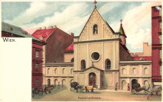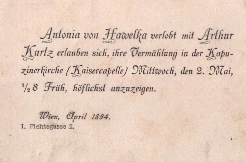 Diese Ankündigung der Hochzeit des Malers Arthur Kurtz mit Antonia von Hawelka, am 2. Mai 1894 in der Kaiserkapelle der Kapuzinerkirche (Kirche zur Heiligen Maria von den Engeln) am Neuen Markt im Ersten Bezirk in Wien.