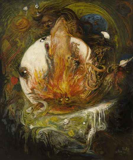 Auf die Erschütterung der althergebrachten Ordnung reagierten die Künstler in sehr unterschiedlicher Weise. Paul Gauguin reiste auf der Suche nach dem irdischen Paradies in die Südsee. Andere wählten den Weg nach Innen, ins Geistige, in das Reich der Fantasie, der Andeutungen, Zeichen und des Okkulten. Zu letzteren gehört der österreichische Maler Arthur Kurtz, von dem dieses Meisterwerk des Symbolismus stammt. Kurtz, in der Steiermark geboren, an den Akademien in Graz und München ausgebildet, war einer der gefragtesten Porträtisten seiner Zeit. Auftraggeber fand er vor allem in der Aristokratie: Während eines seiner ausgedehnten Aufenthalte in Marienbad malte er König Eduard VII. von England, auch mehrere Bildnisse von Angehörigen des österreichischen Kaiserhauses sind von ihm bekannt. Darüberhinaus betätigte er sich als Schriftsteller, vor allem um seine späteren Arbeiten wie „Weltperpetuum“, „Kometenzauber“ und „Jubelnde Welt-Farbenphilosophie“ zu kommentieren.