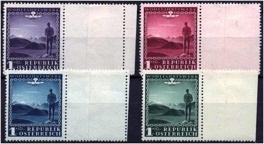 Ab 24. November 1945 vereinfachte sich die Versorgung mit der Ausgabe neuer österreichischer Postwertzeichen in Groschen und Schilling, die wieder im ganzen Land verwendet werden konnten. Die Freimarken der friedevoll wirkenden Reihe „Landschaften“ sind in ihrer zarten Ausführung in Halbtönen des Rastertiefdrucks durchaus gelungen (MiNr. 738-770).  Bei größeren Farbschwankungen haben sich einige Unternummern etablieren können, deren Spitzensorten heute beachtliche Beträge verbuchen können. Die als „Steingrüne“ beachtete MiNr. 756b, die dunkelgraugrüne 38 Groschen mit dem Langbathsee, bringt es nach Michel-Spezialkatalog 2015 auf 500 bis 1100 Euro. Die gebrauchte 50 Groschen „Silvretta“ kann dunkelblau auf dickem Papier 250 Euro verbuchen (MiNr. 760 yb). Früher mit 18 Mark oder bis elf Euro geführt, kommt eine MiNr. 763b in Blau (dunkellilaultramarin) statt Violettblau nun auf ** / o jeweils 150 Euro!